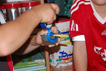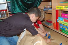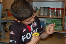 Osman, Kevin en Gino maken een huis. Ze hebben het papier als een muur rechtop vastgeplakt aan de vloer. Osman maakt eerst een trap, Hij doet dat door het rietje verticaal door te knippen. Dan maakt hij een bol van bruin en blauw plakband. Dat is de kamer. Daar komt de trap aan.