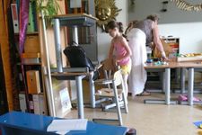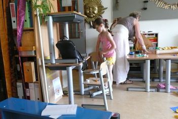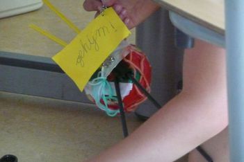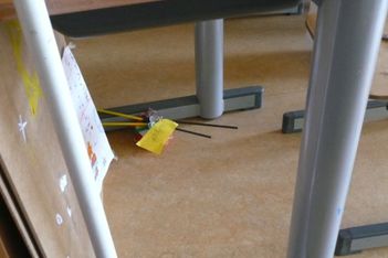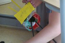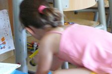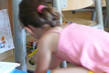 Sigrid maakt een geheim. Ze gaat onder de tafel aan het werk en legt het daar neer. Later loop ze ermee rond om aan anderen te laten zien. Er zit ook een kettinkje aan. Ze vindt het geheim grappig.