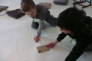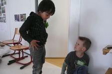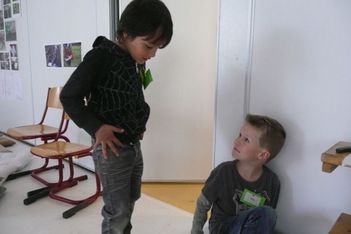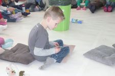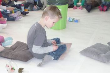 Renzo heeft een slakje mee naar binnen genomen. Hij zit met het slakje in zjn hand in de kring. Omdat het tijd is om te eten zet hij het slakje op het bankje dat vlak naast hem staat. Na het eten is zijn slakje verdwenen.