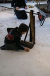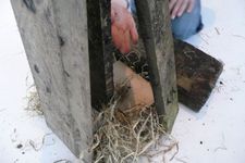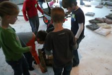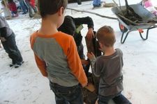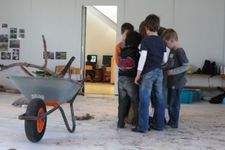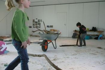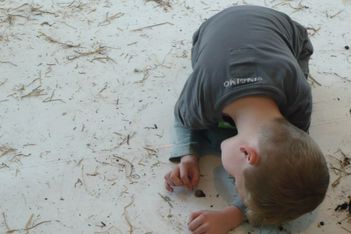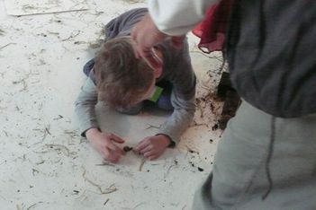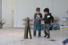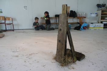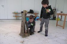 Renzo legt de slak in 'het plekje'. Ik heb een deken voor hem (legt stro over het huisje van de slak). Nog meer muur! Nog meer muur! Hij moet ook een bedje. (Hij moedigd Liam aan door te bouwen.)