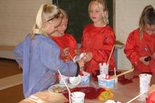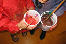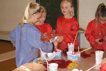 Op tafel staan twaalf verschillende kleuren rode verf klaar en oranjerood, roze, wit en oranje papier in verschillende formaten. De kinderen gaan meteen roeren in de verf. Liesbeth vraagt ze de kleuren een naam te geven: Bruinrood, oranjerood, donkerrood, rozerood, donkerbruinrood, blauwrood, paarsrood. Het valt de kinderen op dat sommige kleuren veel op elkaar lijken. Door een stipje verf van het ene in het andere bakje te doen, merken ze dat er dat er echt verschil is: "ja, die is meer oranje."