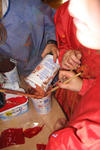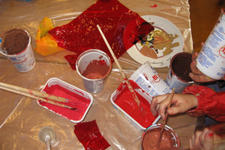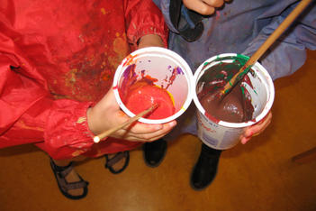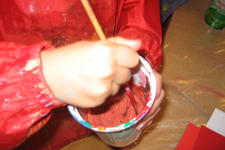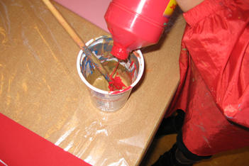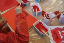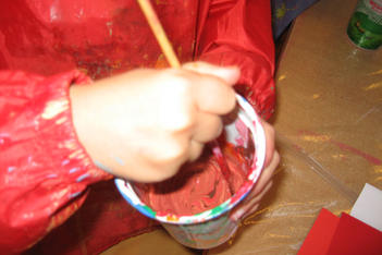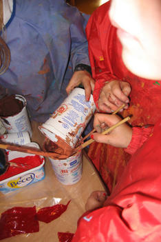 "rood" heeft vanochtend met allerlei kleuren rood geschilderd. Sommige kinderen gingen meer op in het mengen, anderen waren meer met het schilderen zelf bezig.Daarna werden er rode doosjes, objecten en assemblages gemaakt.