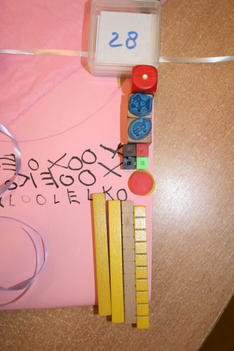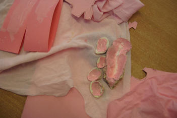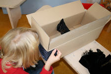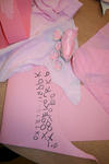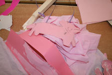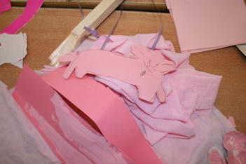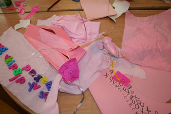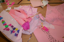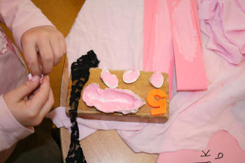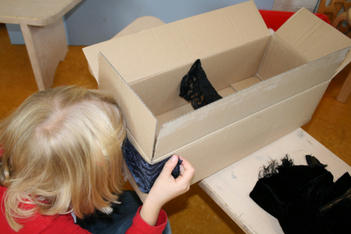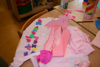 Een wereld in één kleur verkennen Laura Laura komt uit het atelier met haar handen vol spullen. Ze laat de roze verzameling op tafel vallen. Pakt roze verf en schildert roze op roze stroken papier. Dan gaat ze weer naar het atelier. Ze komt terug met schelpen. Horen de schelpen bij roze? Ja want ik ga ze roze verven. Laura knipt een rode hond uit een stuk behang. Ze bekijkt hem goed en tekent hem na op een stuk roze papier. Even later is de hond een poes geworden, uitgeknipt en hangt hij aan twee paarse lintjes aan een stuk hout. Ze laat de poes lopen. Uit roze sitspapier knipt ze twee vlinders. Met plakband maakt ze er een lintje aan. De vlinders vliegen door het hele lokaal. Na wat rondlopen schrijft ze met een stift allerlei letters op het roze stuk papier op tafel: een roze verhaal. De poes ligt achter het papier te slapen. Laura pakt een bak met gekleurde letters uit de kast en legt die op een rij bij haar spullen. Wat staat er, vraagt ze aan Liesbeth. “dlvgkip” een droevige kip! Met letters, blokjes, stempels, fiches en een dobbelsteen in allerlei kleuren bouwt ze verder…. “mijn roze stad!” Annemarie Annemarie heeft een zwarte plaat gevonden met holletjes. Ze knipt de zwarte dingen die ze heeft gevonden in kleine stukjes en legt ze soort bij soort in de holletjes. Ze kijkt door de zwarte lapjes heen. Door sommige lapjes kan je kijken, door anderen niet. Annemarie wil een doos hebben. In een doos kan je een zwart doorzichtig stofje ophangen. Maar hoe maak je dat vast? Kan Liesbeth het vast houden? Ja, even…. maar daarna? Met een kleine niettang komt Annemarie niet op de plek in de doos waar ze het lapje wil vastmaken, de grote niettang niet niet goed….. maar met hulp van juf hangt het doorzichtige lapje in de doos. Daarna wil ze gaten in de doos maken. Bij de kleuterbouw haalt ze een prikpen. Ze kijkt door het gat wat ze geprikt heeft heen naar het zwarte lapje in de doos. Er moet nog een gat in de doos…. dan kan je met allebei je ogen kijken! Dalya en Julia Dalya en Julia werken samen. Zonder veel praten, lijken ze toch allebei te weten wat ze moeten doen. Ze maken een spookhuis, want een spookhuis is zwart. In een kartonnen doos tekenen ze spinnenwebben en rode bloedspetters. Er komt een zwart kleedje op de grond, een schilderij met zwart, wit en rood aan de muur. Julia plakt zwarte strookjes aan een papieren ring. Zo maakt ze een spin. Om de pootjes goed vast te plakken, doet ze een knijpertje op elk pootje van de spin.