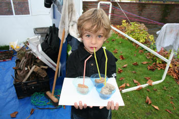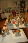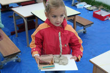 Aan het einde van de ochtend brengen de kinderen zelf, heel voorzichtig, hun werk naar de tentoonstellingsruimte in de grote zaal. Daar zetten ze alles op de tafel.