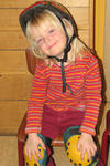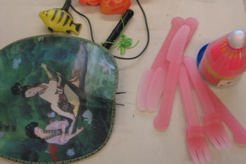 Het waaiertje kon vooral goed dienen als trampoline, de helm als nestje en niet te vergeten de roze bloemetjes fotohanger als vogeltjes bloementrap.